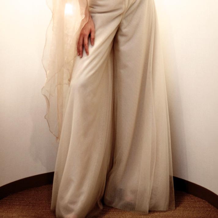 透明感溢れる生地の重なりが、バックトレーンへと流れます。すっきりとしたシンプルさを生かし、あなたらしい自由なスタイリングを楽しむ事が出来ます。