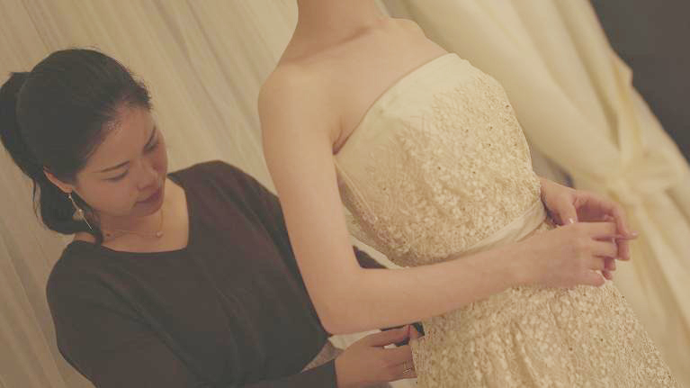 メンテナンスは、通常レンタルには不向きな上質なシルクや繊細なレース、細部までこだわった刺繍技術を用いている事から、生地の差し替えやディティールの差し替えなどにも技術と時間を注ぎます。しかし、そこにも作り手や技術者の愛が注ぎ続けられます。